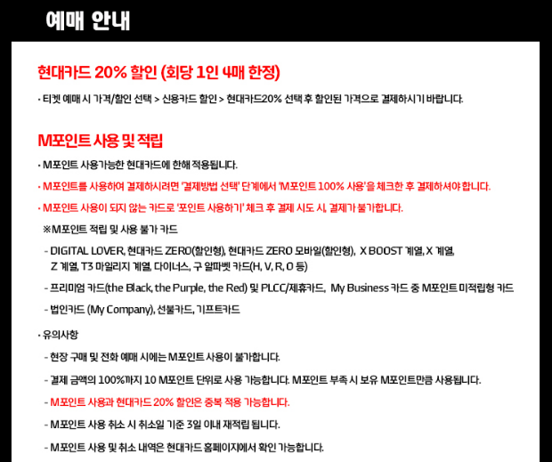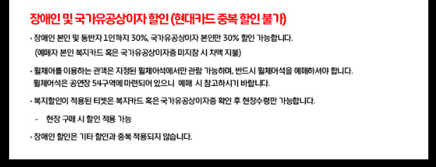 예매 안내에는 현대카드 할인 내용과 장애인 및 국가 유공자 할인 내용에 대해 안내하고 있습니다.
