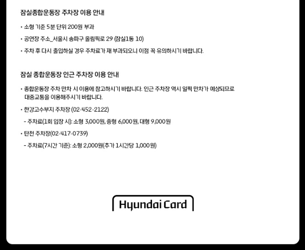 콘서트가 있는 종합운동장 올림픽 주경기장은 2호선과 9호선 종합운동장 역이 인접합니다. 공연장의 주차장은 만차 시 주차가 불가하며, 인근 주차장으로는 한강 고수부지 주차장과 탄천 주차장을 안내하고 있습니다.