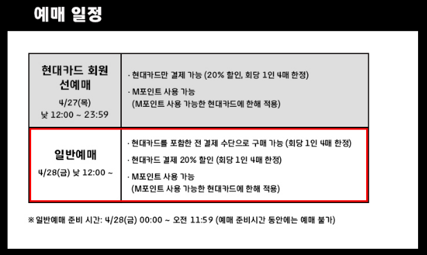 일반 예매의 경우 무통장 미입금 좌석이 풀리는 시간을 노린다면, 취소표를 얻을 수 있으리라 기대됩니다. 4월 29일 자정 시간에 접속하여 해당 티켓을 얻는 경우가 있습니다. 또한, 취소수수료가 부과되는 5월 5일이 시작되는 자정에도 한 번 더 기회를 노려볼 만하다고 여겨집니다. 그러나 주변의 티켓팅 장인의 이야기를 들어보면, 무엇보다도 꾸준히 계속 티켓 구매상에 들어가서 취소 티켓이 나오지 않았는지 수시로 확인하는 것이 제일 중요하다고 합니다.