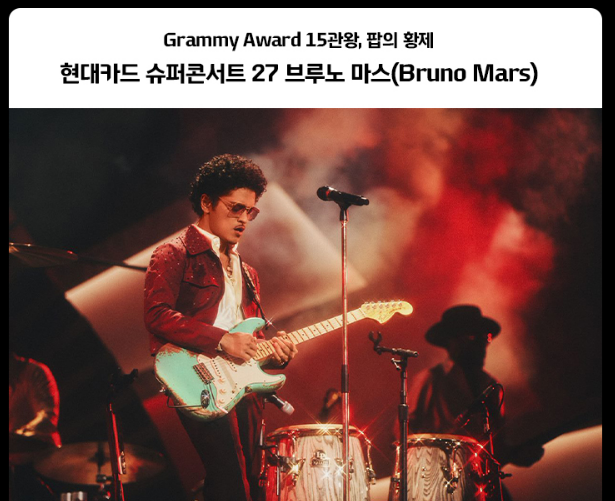 스물일곱 번째 현대카드 슈퍼 콘서트에는 ‘브루노 마스(Bruno Mars)’가 옵니다. 다음 달, 6월 17일과 18일 이 동안 서울 잠실종합운동장 올림픽 주경기장에서 개최된다고 합니다. 현대카드 회원 선예매는 어제 27일 오후 12시에 열렸고 일반 예매는 오늘 28일 오후 12시에 열렸습니다. 어제의 경우 동시 접속자 16만 명을 찍었다는 이야기가 나오고 있으며, 예매까지도 1시간 넘게 대기하는 상황이 벌어졌다고 합니다. 대기를 해도 티켓을 예매하는 데 실패하는 경우가 빈번하여, 속수무책으로 취소표를 기다리는 팬들도 늘어나고 있습니다.