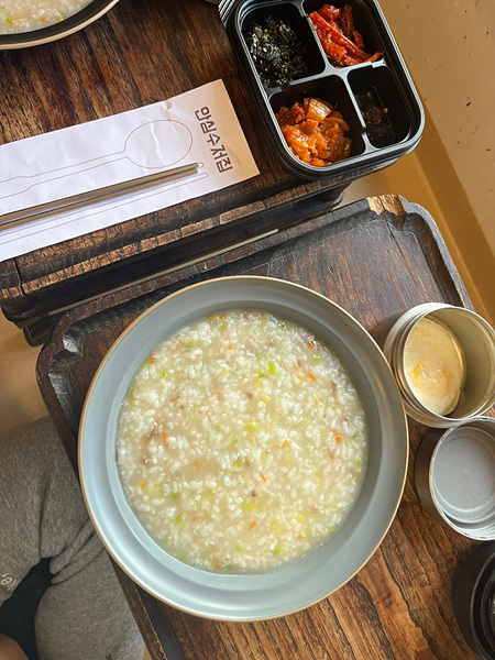 조식과 석식: 조식과 석식 모두 정갈하고 맛있게 나옵니다. 체크인을 했던 사무실에 시간에 맞춰 가서 도시락 바구니를 받아옵니다. 가을이라면 실외에서 먹었을텐데 겨울이라 방안에서 먹었습니다. 조식은 쇠고기 야채죽과 계란후라이, 밑반찬으로, 석식은 밥과 국, 제육볶음, 밑반찬으로 구성되어있습니다. 사장님께서 카카오톡으로 숙소 관련 안내를 주셨을 때 식사를 사전에 신청할 수 있습니다. 체크아웃하며 식사비(1인 조식:7,000원, 석식:13,000원)를 한번에 결제합니다.