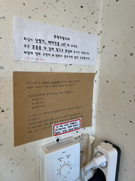 이동 및 주차: 숙소까지 이동할 때에는 산을 타고 꽤 굽이굽이 들어가야 합니다. 작은 마트도 15분에서 20분 정도 차를 타고 나와야합니다. 숙소에 대한 특이사항, 주의해야 하는 내용들, 미리 숙지하고 알아야하는 정보들은 사장님께서 카톡을 통해 세 차례 정도 안내를 주십니다. 또한 방문 당일에는 어떤 장소들에 주차가 가능한지도 직접 촬영한 영상 링크를 보내주실 정도로 안내가 꽤 세세하게 이루어집니다. 세 차례의 안내와 주차 장소 영상 등을 살펴보며 그 동안 숙박업을 운영하시며 시행착오들을 여러 번 겪으셨나보다고 어림짐작을 해보게 되었습니다. 지례예술촌에 들어가자마자 왼쪽에 있는 주방 겸 사무실에서 체크인을 하면 사장님께서 다시 한 번 각각의 공간을 안내해주십니다.