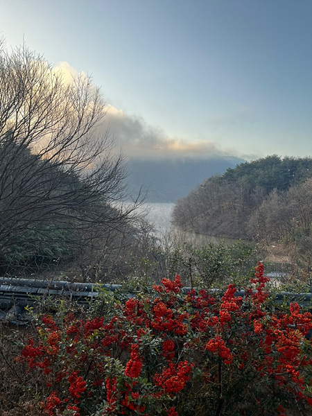 윤슬과 물안개를 감상할 수 있는 산책로: 계절별로 윤슬을 잘 볼 수 있는 시간대를 안내해주십니다. 지례예술촌 주변으로 산책로가 조성되어있어 조식을 먹고 한 바퀴 돌았습니다. 산책을 하면서 호수위로 빠르게 움직이는 물안개와 수시로 반짝거리는 윤슬을 감상할 수 있습니다. 숲길이다 보니 낙엽도 잔뜩 쌓여 겨울의 정취를 한껏 느낄 수있었습니다.