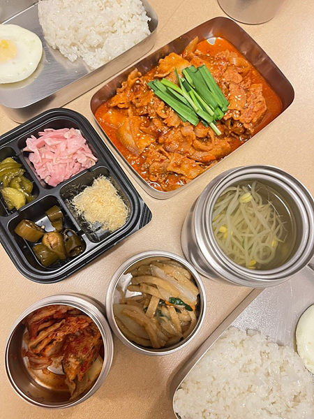 조식과 석식: 조식과 석식 모두 정갈하고 맛있게 나옵니다. 체크인을 했던 사무실에 시간에 맞춰 가서 도시락 바구니를 받아옵니다. 가을이라면 실외에서 먹었을텐데 겨울이라 방안에서 먹었습니다. 조식은 쇠고기 야채죽과 계란후라이, 밑반찬으로, 석식은 밥과 국, 제육볶음, 밑반찬으로 구성되어있습니다. 사장님께서 카카오톡으로 숙소 관련 안내를 주셨을 때 식사를 사전에 신청할 수 있습니다. 체크아웃하며 식사비(1인 조식:7,000원, 석식:13,000원)를 한번에 결제합니다.